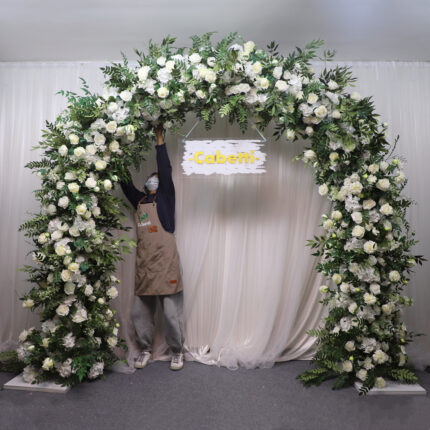 Couture Finest Floral Styling 8ft High White Silk Flower Green Leaves Artificial Flower Arch Frame for Wedding Decoration