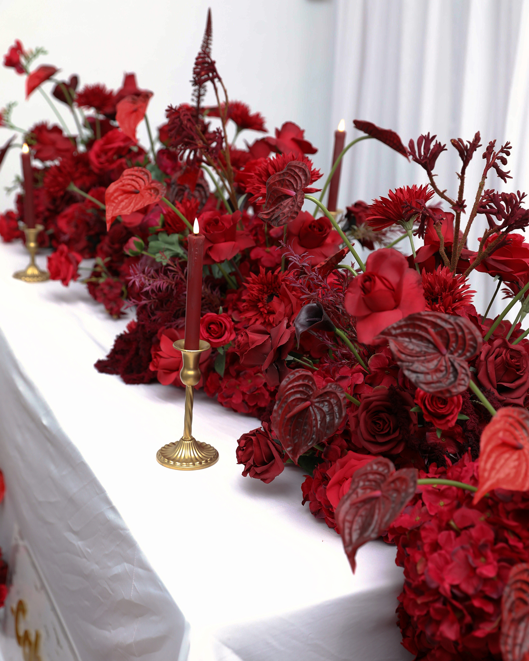 Custom Upscale Silk Flowers Burgundy Red Rose Flower Runner High Quality Silk Artificial Flower Row For Wedding Table Centerpiece