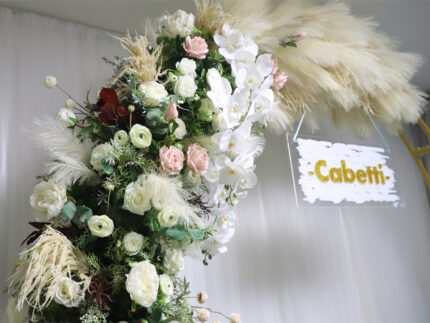 Custom Premium Floral Styling Moon Shape Arch Pampas Rose Leaves Plants Wedding Artificial Flower Arch With Metal Frame